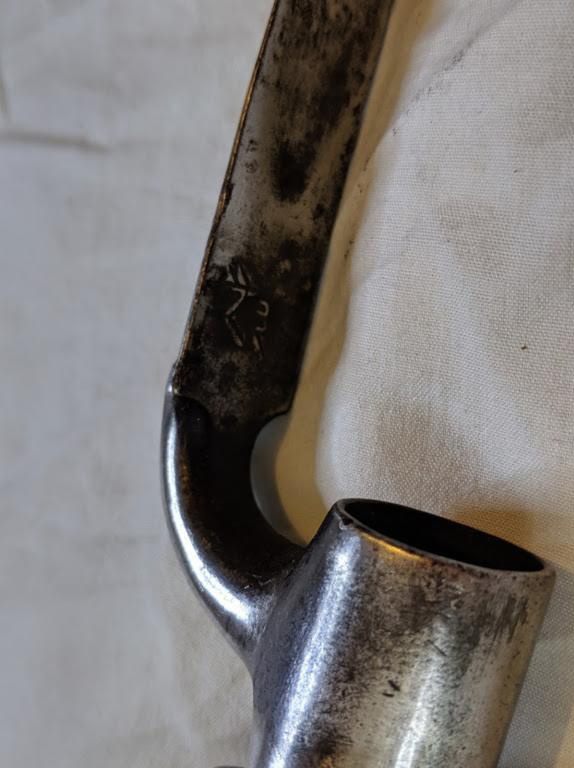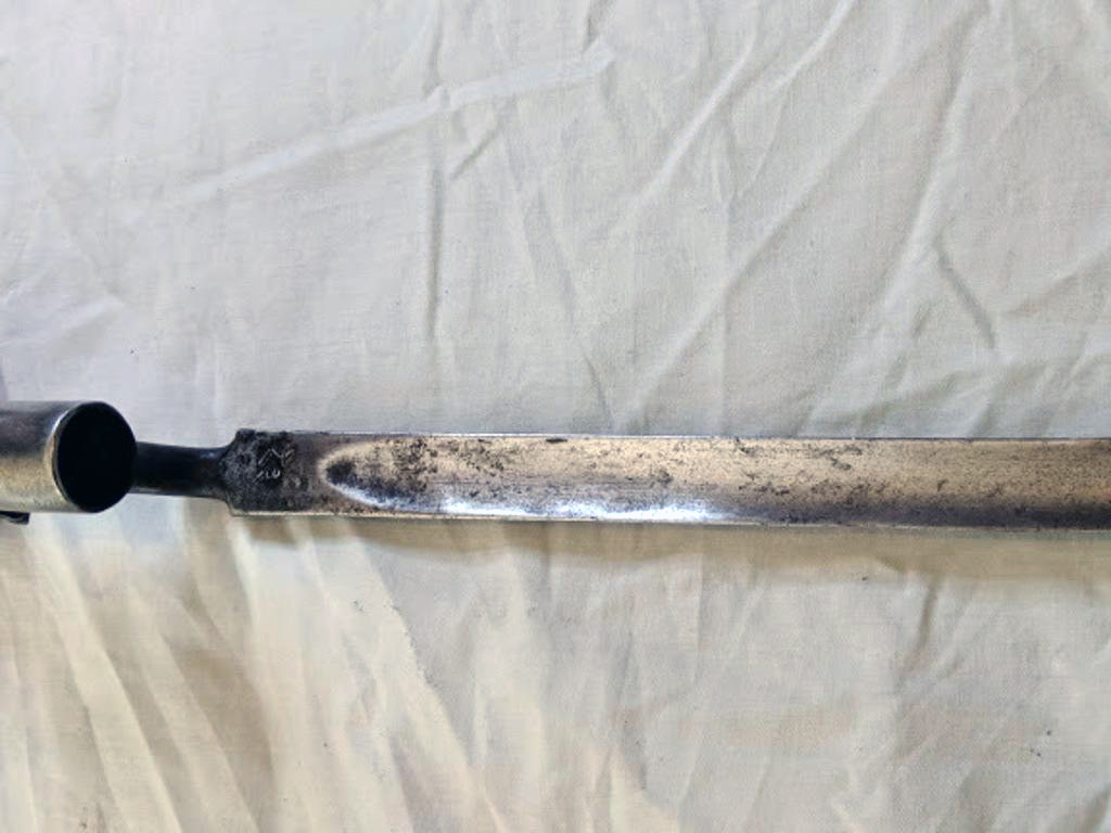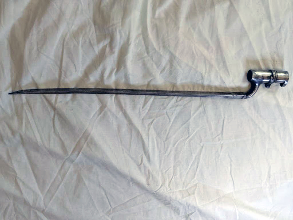 This original angular socket bayonet was made for the Model 1853 Enfield muzzle loading rifle-musket. It saw service in the Crimean War, American Civil War, New Zealand Land Wars and the Indian Mutiny to name a few. It is a typically British design in that it has a blade "shoulder" and is shallow fullered. It was attached to the musket by fitting it over the barrel muzzle and fastened into position by means of a mortise slot and locking ring.