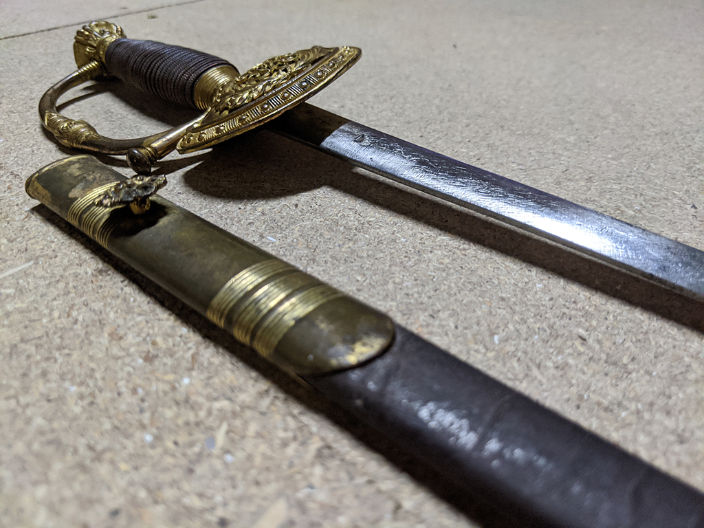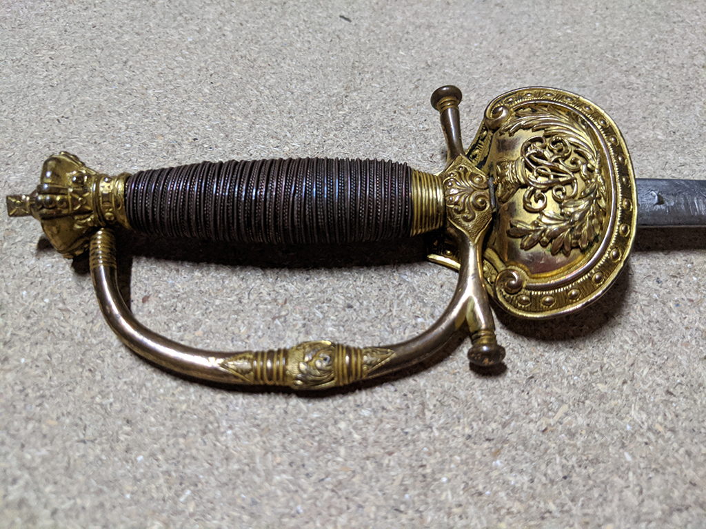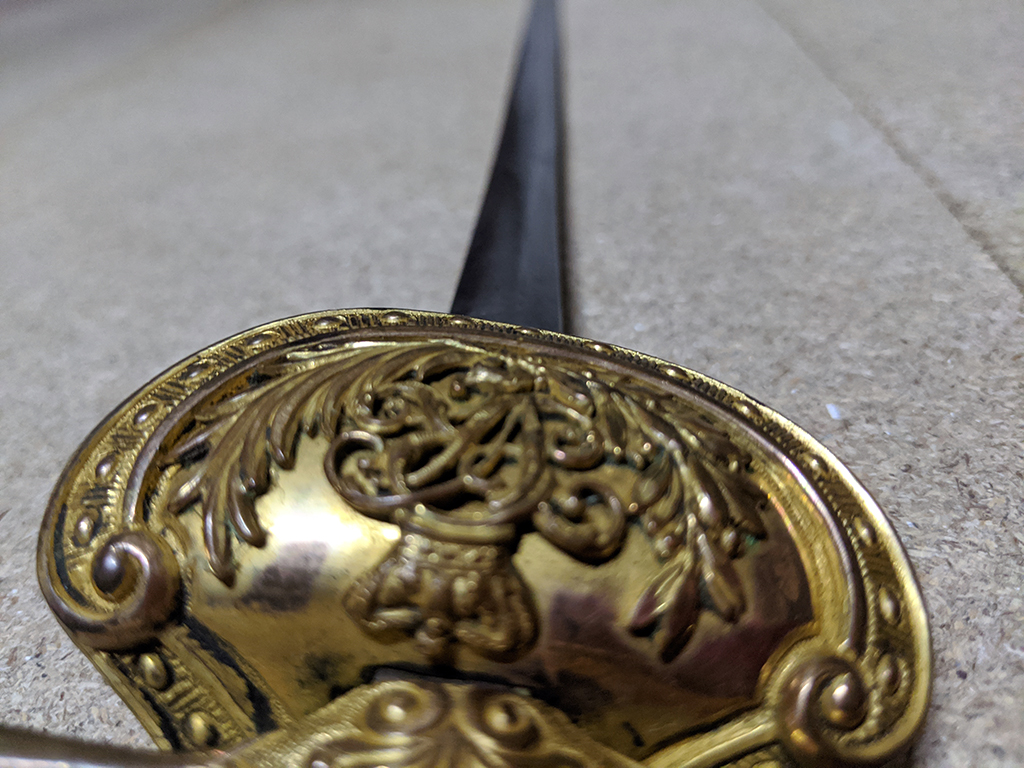 It still has its original sheathe of black leather, with a gilt brass throat and drag, although most of the gilt has rubbed off the throat, likely from nearly two centuries of handling when drawing the blade. The brass has decorative engraved rings and a floral motif on the throat, which would have worked in conjunction with a “frog” for the sword to hang from. The bindings at the rear of the leather appear to have fallen out and there is a suspected central brass fitting missing, causing the sheathe to sag in the middle when the sword is drawn. Despite this the scabbard has managed to maintain its overall structural integrity, likely owing to the binding of the brass throat and drag still holding firm, though I would advise drawing the sword as intended (held vertically, not horizontally). It is 35.5 inches long in total, with a 30 inch blade.