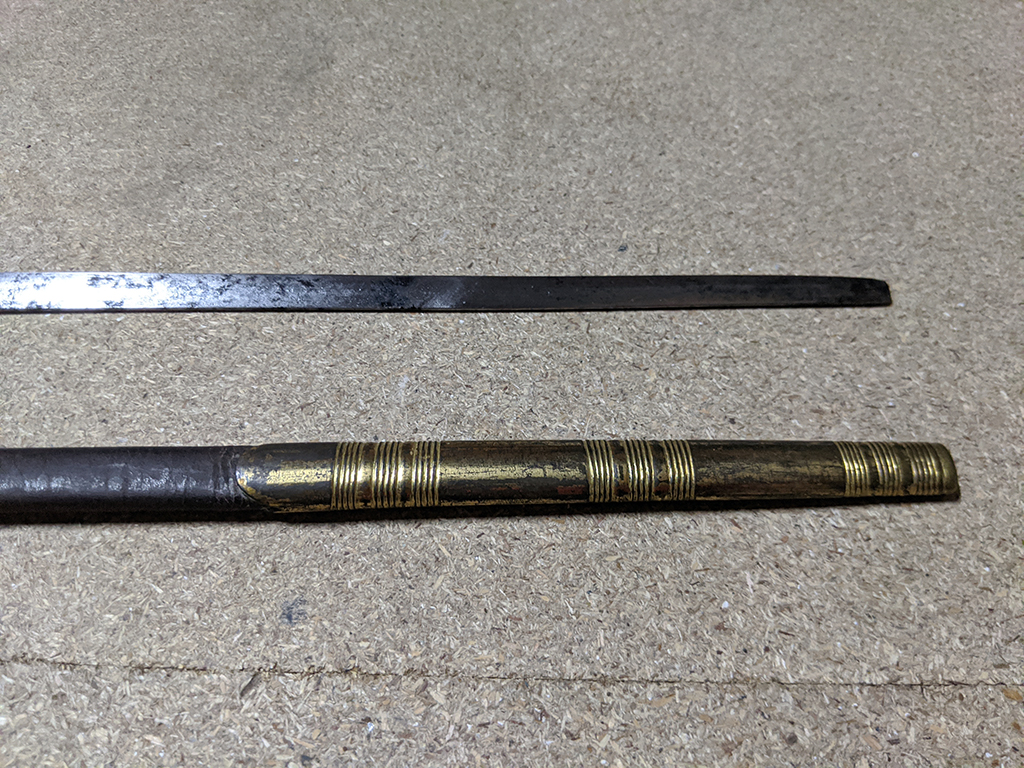 The leather washer holding the guard together seems to have survived on the blade side of the clamshell mount, but not the crossguard side, which has caused it to be a little loose. The tip is blunt and was most likely originally made that way as it does not appear to be broken, instead it terminates in a straight flat end.